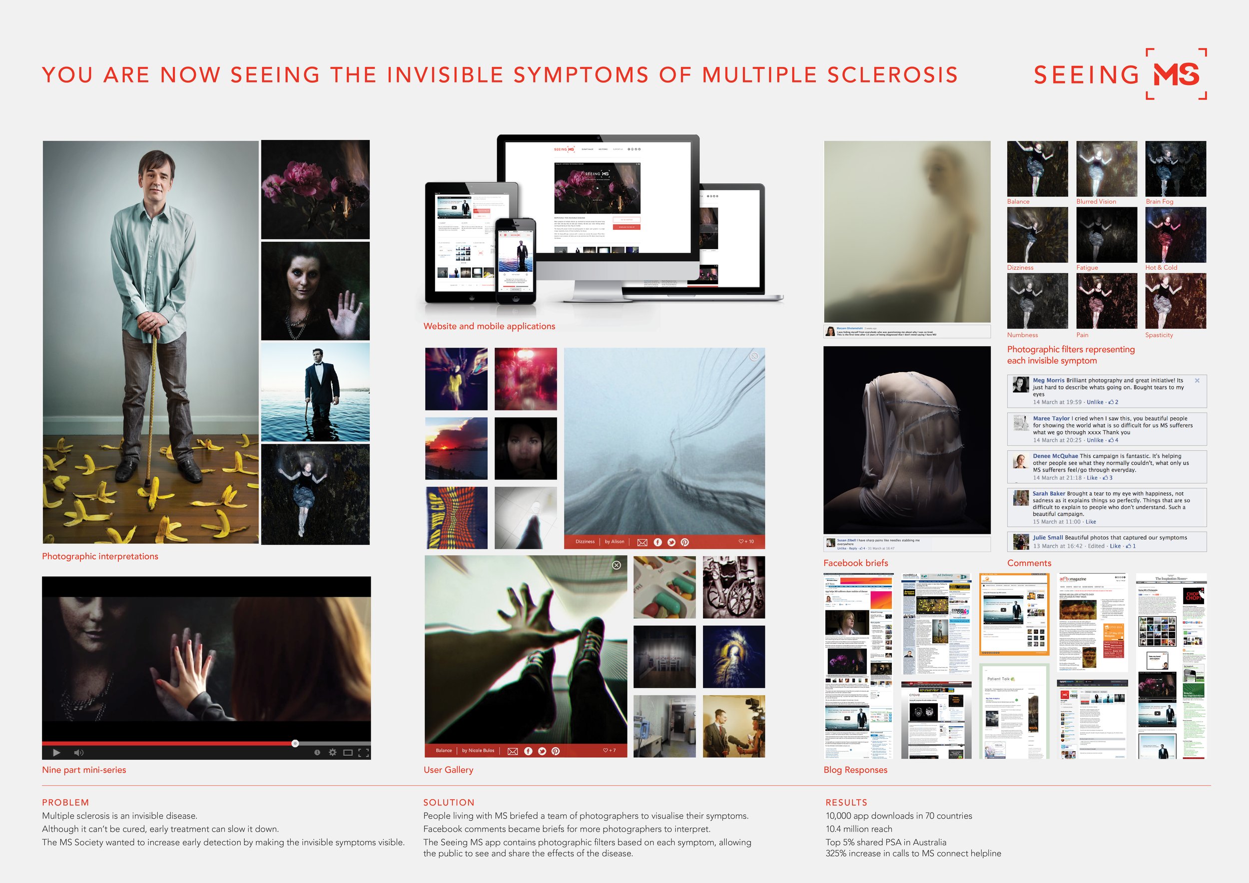 Collaborating with top Australian photographers to create Seeing MS, a striking visual campaign to raise awareness of multiple sclerosis created a unique insight into the disease many found hard to describe. Partnering with people living with MS, these photographers produced images that interpreted the disease’s invisible symptoms. The photos, exhibited online and in galleries, also led to the development of an innovative app, allowing users to experience these symptoms through photographic filters. An exhibition was held where the imagery was shown and multiple sclerosis sufferers and medical practitioners gathered to share their stories.
